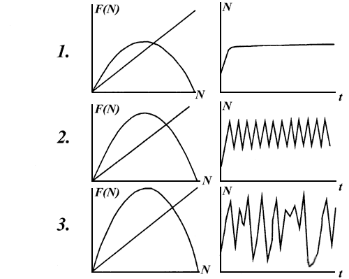 параметра r: 1 - ограниченный рост; 2 - колебания,